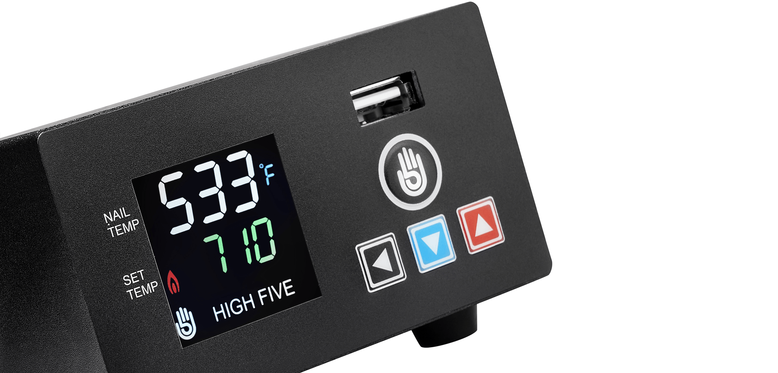 Powered by an advanced microprocessor for real time temperature reading and temperature stabilization unlike PIDs used by other E-Nails on the market. The most advanced desktop E-Nail on the market that allows you to fully take control of your session. Set your controller to the exact coil size you're using for optimum temperature control and performance. The LCD E-Nail has a rapid heat up time which only takes 90-120 seconds. Customizable displayed temperature in Celsius and Fahrenheit. Set and forget, this unit features a timer/auto shut off to ensure that your unit turns off when you want and you'll never have to worry about turning it off. Cleaning is a breeze with the LCD E-Nail, utilize the unit's self cleaning mode for built up residue and easy maintenance. The control unit also has a USB port for charging other devices and accessories.